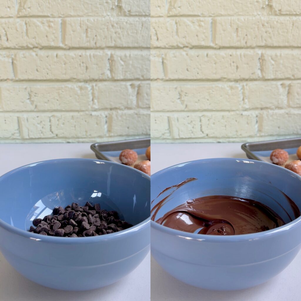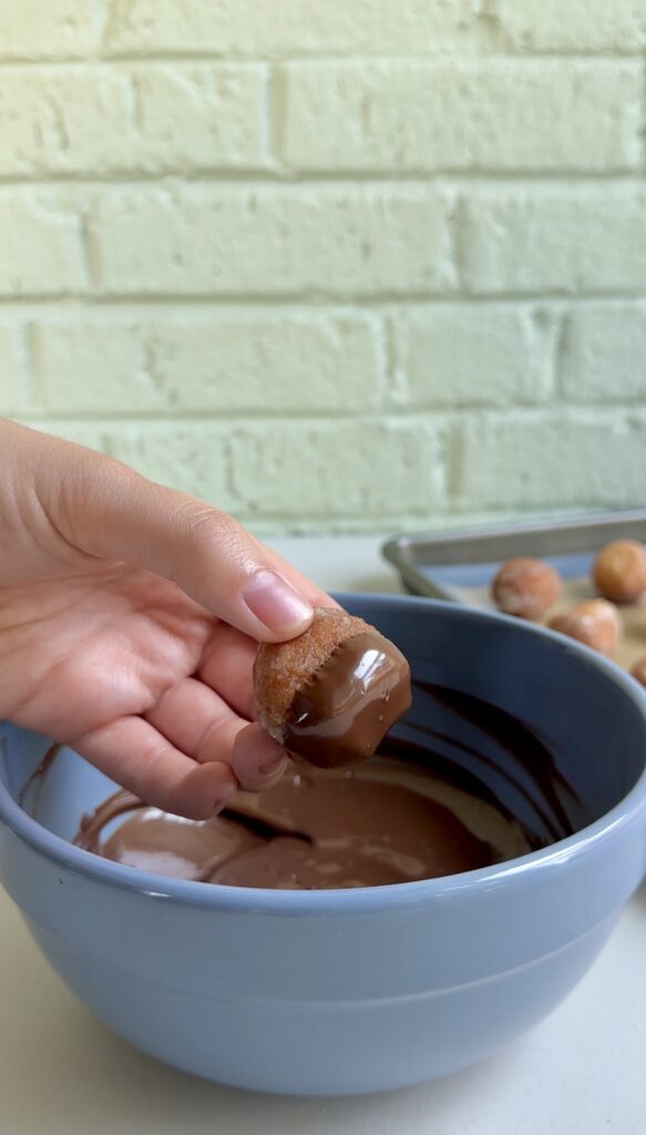 - Working one by one, dip the top part of the donut hole in the melted chocolate and then immediately dip into a bowl of sprinkles.