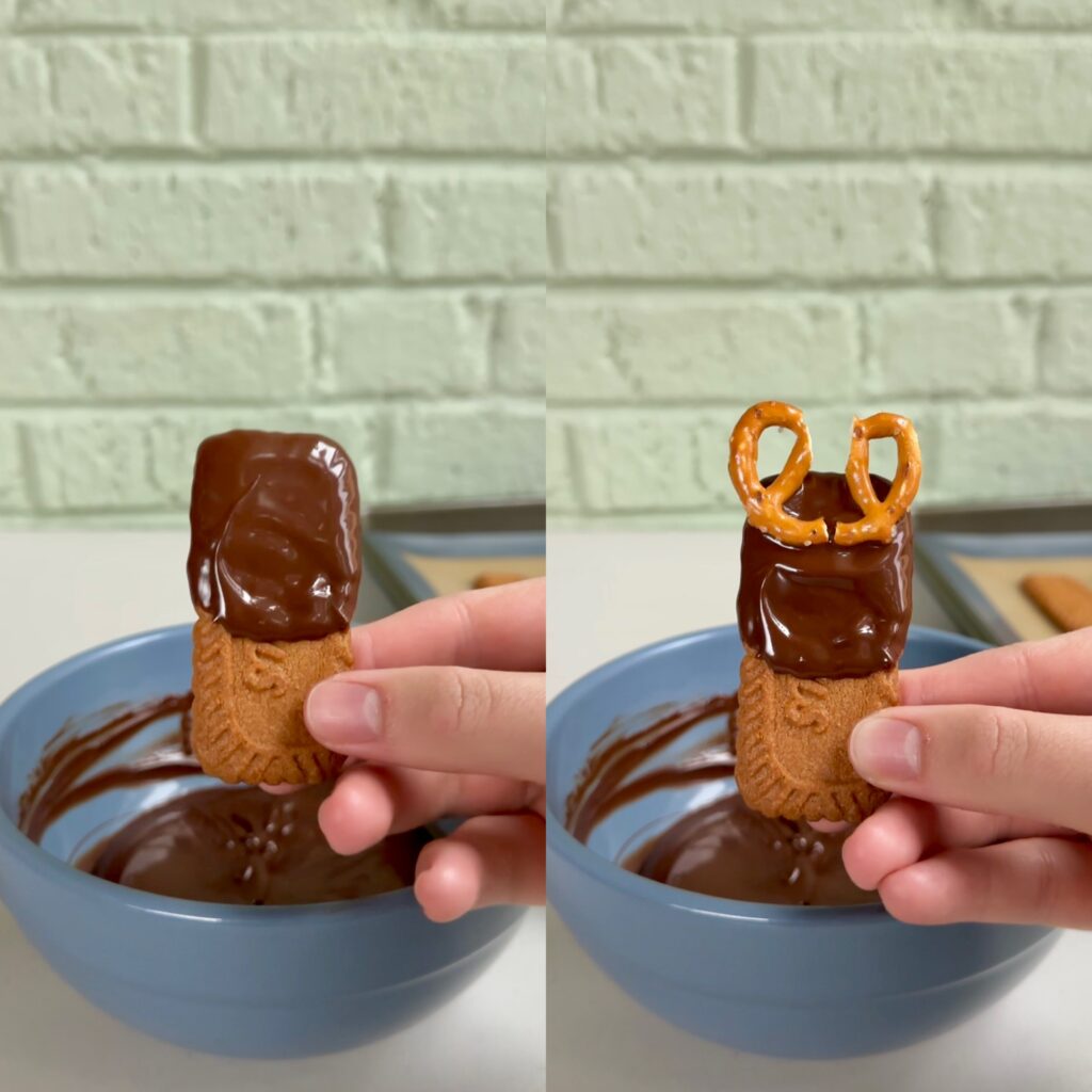 - Grab a biscoff cookie and dip the face of the cookie into the melted chocolate, then place onto the prepared baking sheet. Repeat until all cookies are dipped.