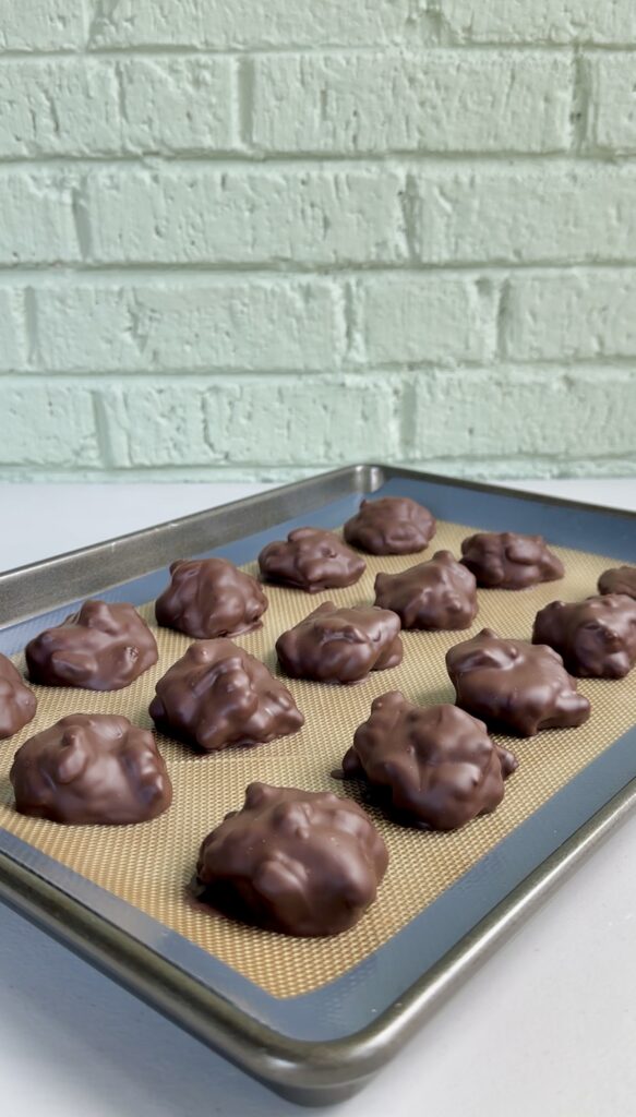 - LINING YOUR PAN: Don’t skip the step of lining your pan with parchment paper or a silicone mat! This is super important especially when covering the Caramel Pecan Clusters in chocolate. Lining your pan prevents sticking and makes it easy to peel up the clusters once they’re set.