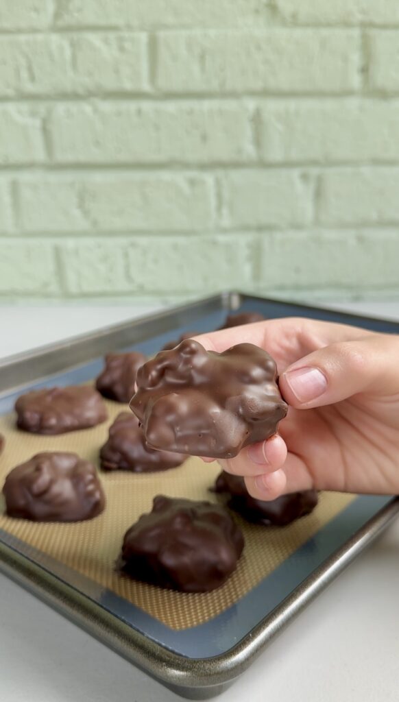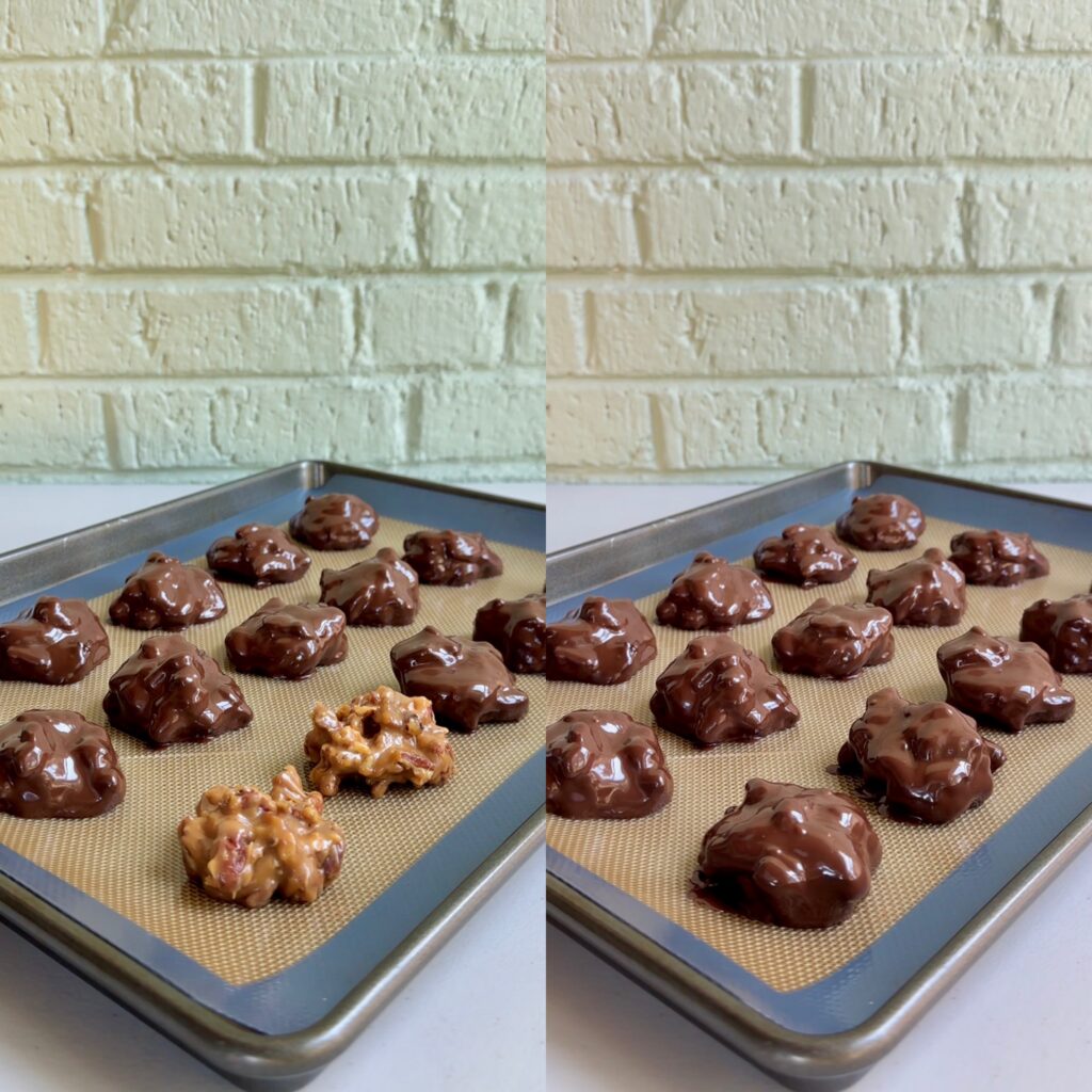 - COATING: After you coat each cluster, tap it against the bowl so the excess chocolate drips off. You’ll also want to scrape all the excess chocolate off the bottom so that it won’t create a pool or “foot” of chocolate once placed on the baking sheet.