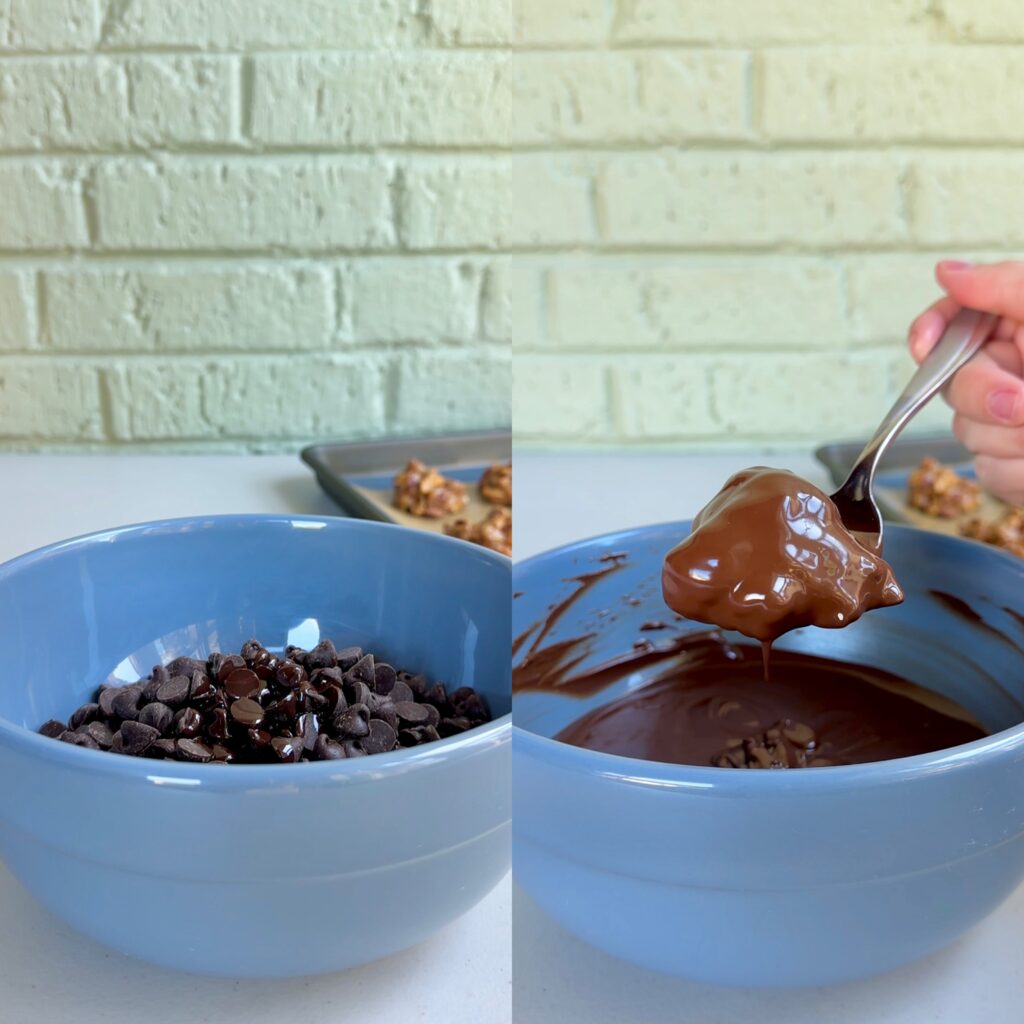- Use a fork to coat the clusters in melted chocolate, tapping the fork against the side of the bowl to allow the excess chocolate to drip off, then return to the prepared baking sheet.
