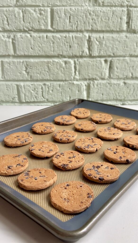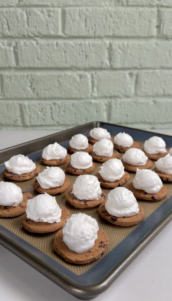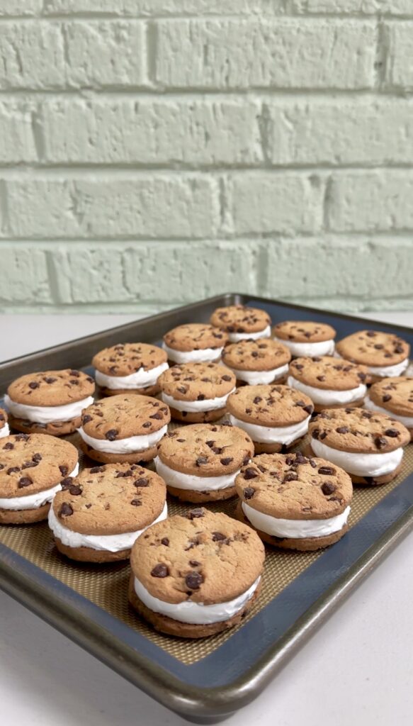 • Line a baking sheet with parchment paper or a silicone baking mat and arrange half of the chocolate chip cookies (flat side facing up), then set aside.