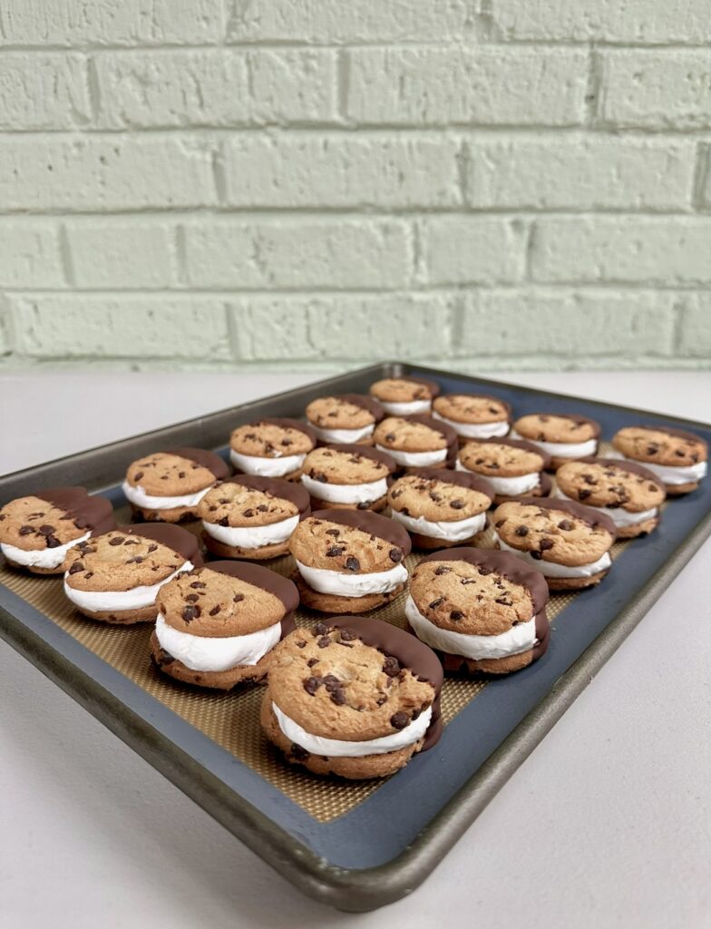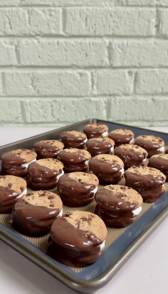 • PREPARED BAKING SHEET: Be sure to let the chocolate dipped cookie sandwiches set on a sheet of parchment paper or a silicone mat to prevent sticking. This ensures the chilled chocolate will easily release from the baking sheet when you’re ready to enjoy.