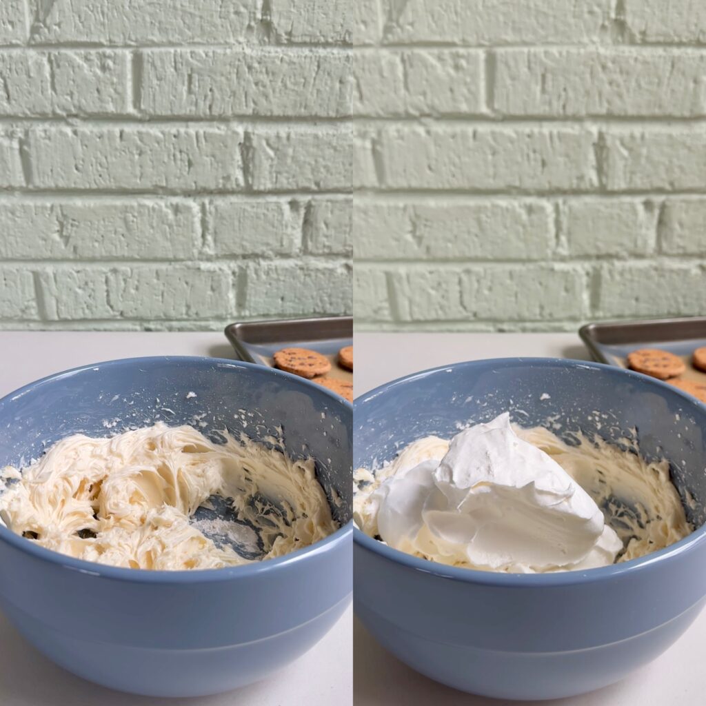 • In a medium mixing bowl, combine softened cream cheese, powdered sugar and vanilla extract. Mix until smooth, then gently fold in the thawed Cool Whip.