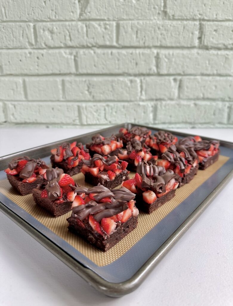 - COOLING: It’s important to let the brownies cool completely before topping them with your chopped strawberries. If you top warm brownies, the brownies will likely absorb the juices from the strawberries and become soggy more quickly..