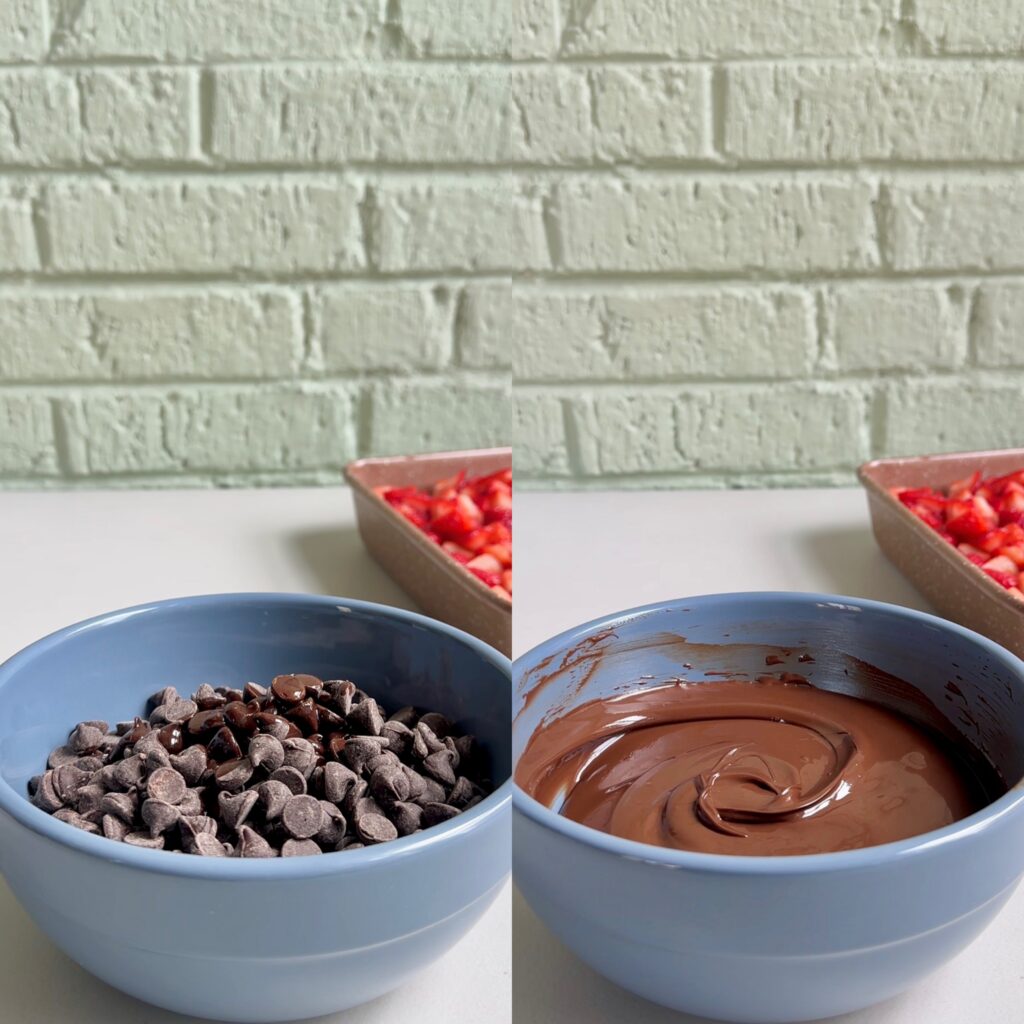 - Transfer the melted chocolate into a ziplock bag, cut off one end, and drizzle over the strawberries.