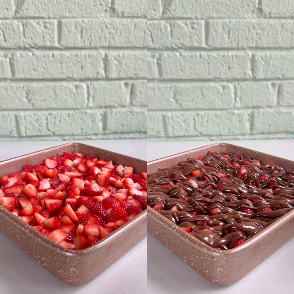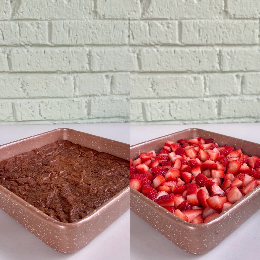 - Wash, dry, and chop your strawberries into bite-sized pieces, then spread them into an even layer on top of the baked brownies.