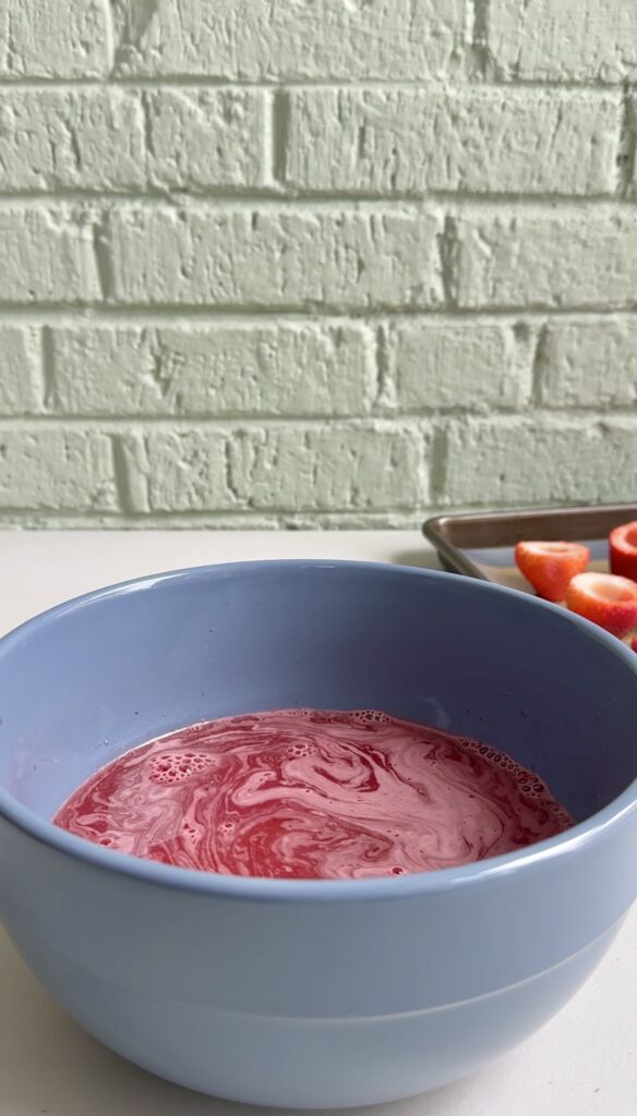 - POURING: Transferring the jello mixture into a measuring cup or some other container with a spout makes it much easier to pour the mixture evenly into the strawberries without making a mess.