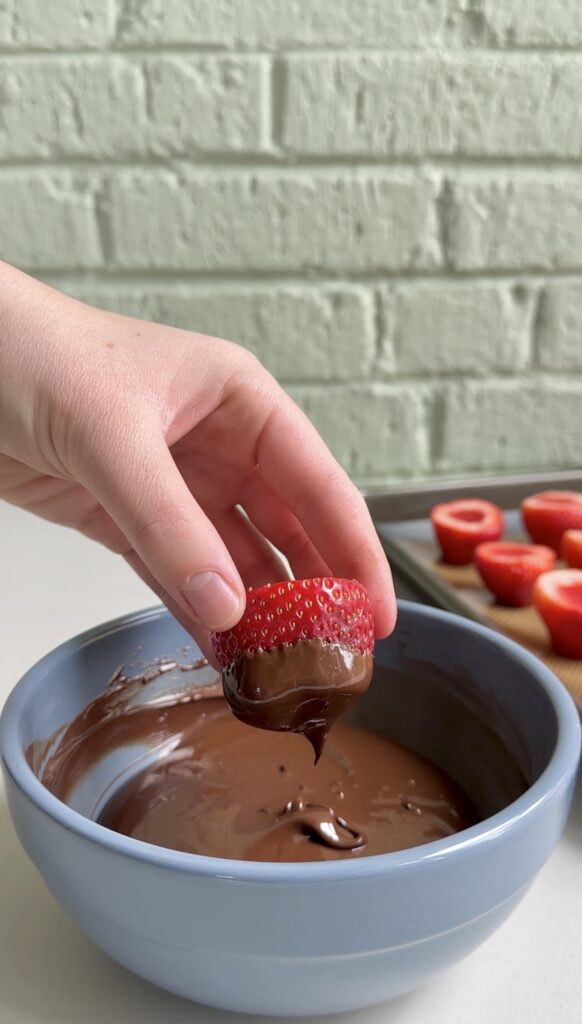 - Dip the bottom half of each strawberry into the melted chocolate and place them on a baking sheet lined with parchment paper or a silicone baking mat.