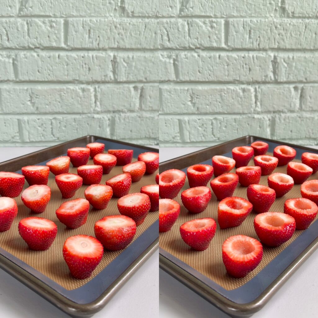 - Use a melon baller to scoop out the center of each strawberry, making sure to not puncture through the bottom.