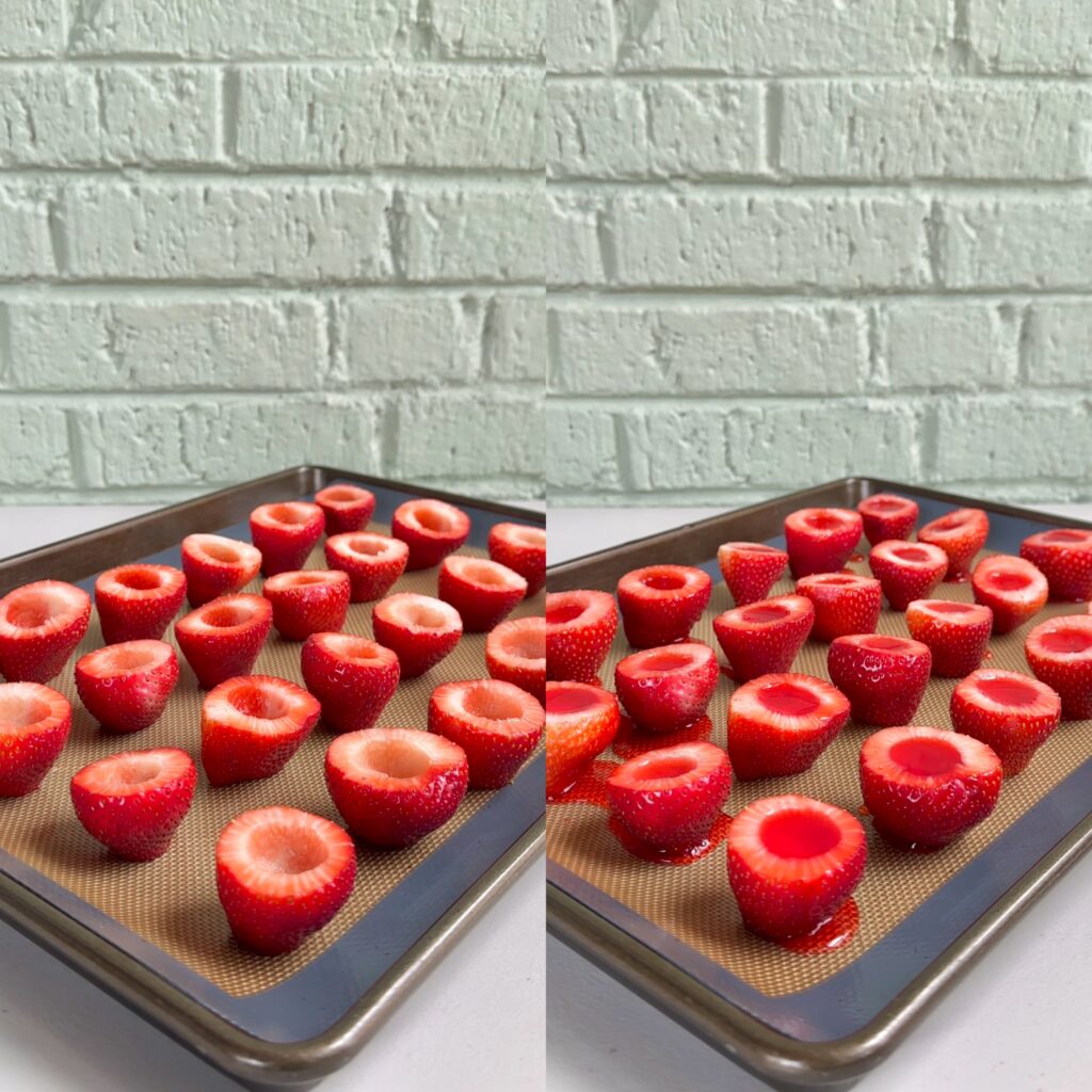 - Pour the jello mixture to fill each strawberry, then transfer to the fridge for at least 2 hours or until the jello has set.