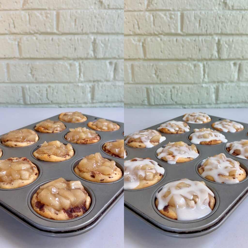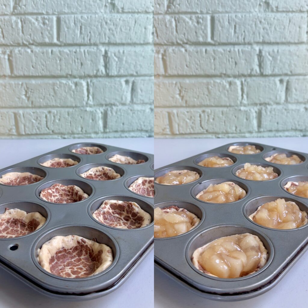 - FILLING: Don’t overfill the cinnamon roll cups! The cinnamon roll dough will puff up a little while baking, and you don’t want your mini apple pies to overflow.