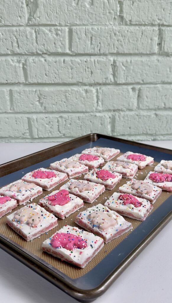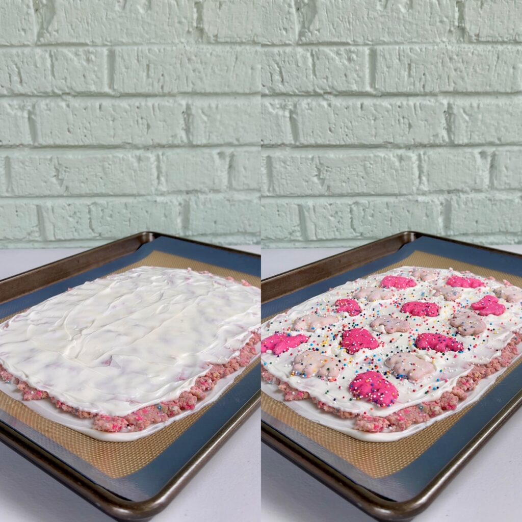 • Immediately top with sprinkles and more circus animal cookies (optional), then return to the fridge or freezer to chill for another 15-30 minutes.