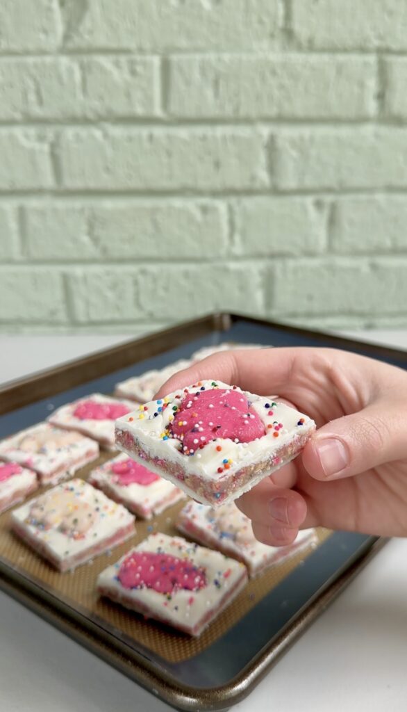 The white chocolate layer also adds a smooth richness that pairs perfectly with the cookie filling. When you bite into a piece of this bark, you get the snap of the chocolate, the creamy truffle layer, and little bits of cookie texture throughout. Topped with extra circus animal cookies and colorful sprinkles, every piece looks playful and festive. It’s the kind of dessert that instantly grabs attention on a dessert table!