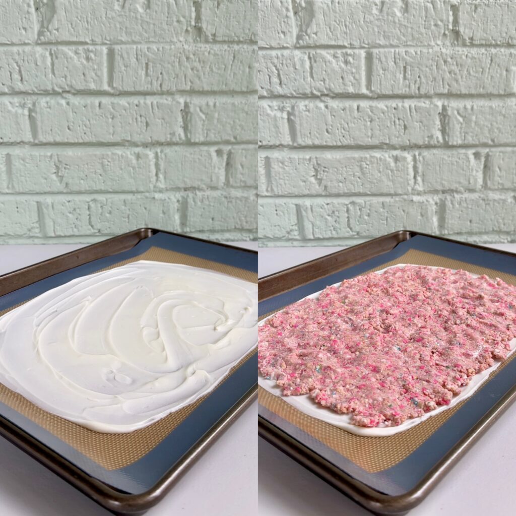 • Pour half of the melted white chocolate mixture onto your prepared baking sheet and spread into a rectangle that’s roughly 9×13 inches in size. Transfer to the fridge or freezer to harden for about 15 minutes.