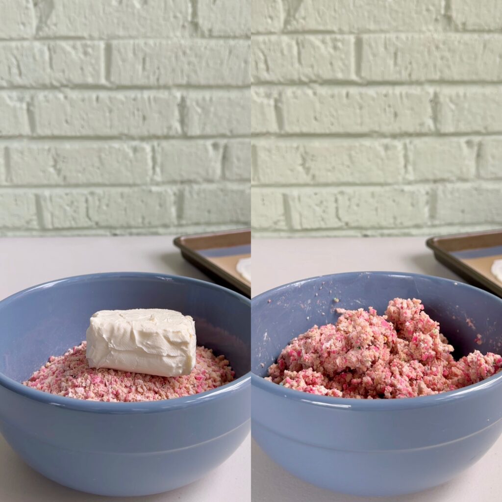 • Pour the cookie crumbs into a medium sized mixing bowl, then add in the softened cream cheese and mix with an electric mixer to form a dough consistency.