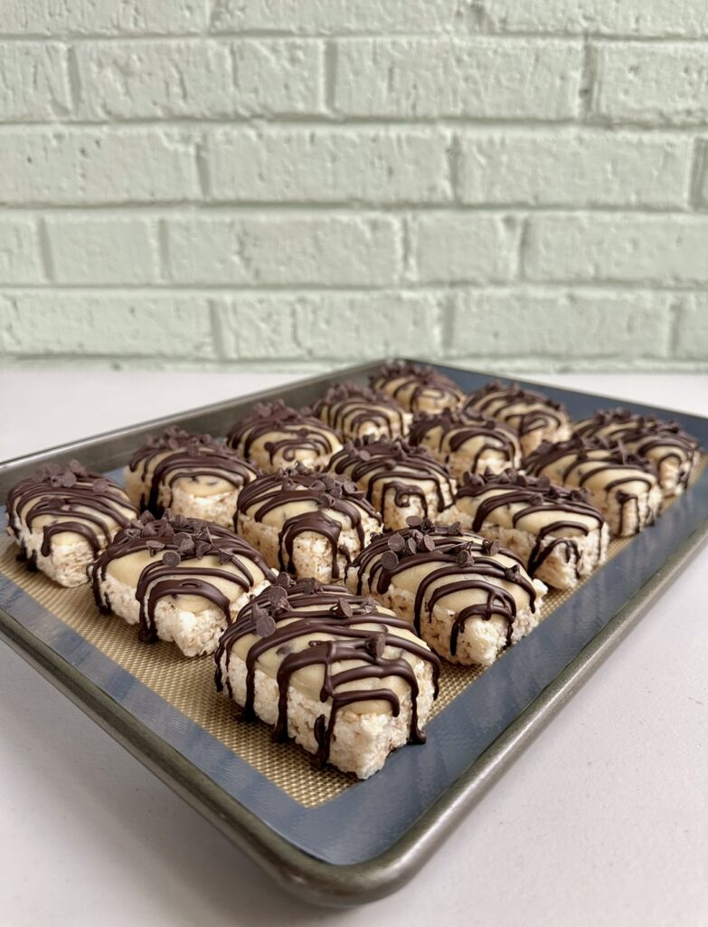 - Unwrap the Rice Krispie Treats and place them on a lined baking sheet, then set aside.