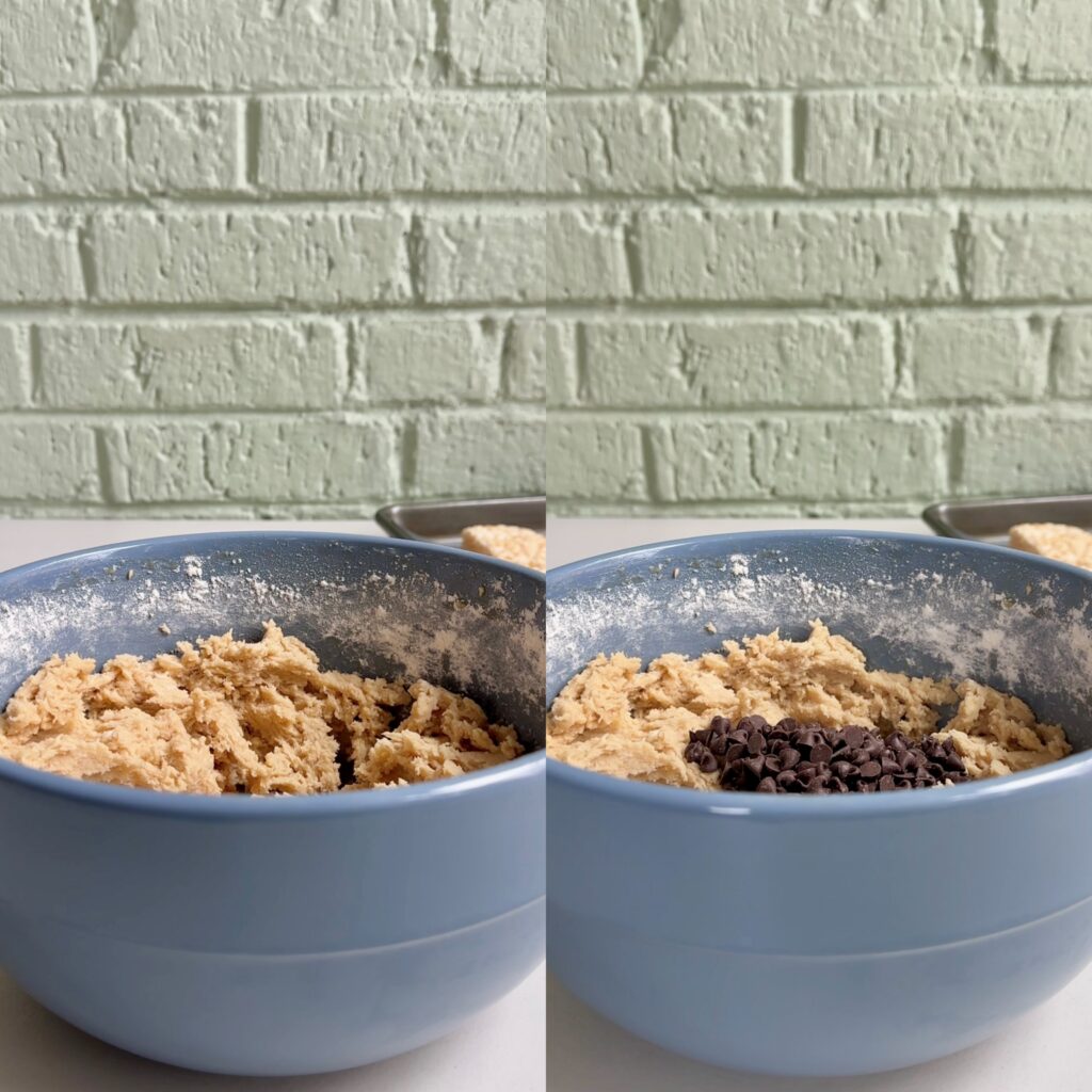 - In a microwave safe bowl, microwave your flour for 60-90 seconds, stirring halfway through. Sprinkle in the heat-treated flour and mix to form a dough, then fold in ½ cup of mini chocolate chips.
