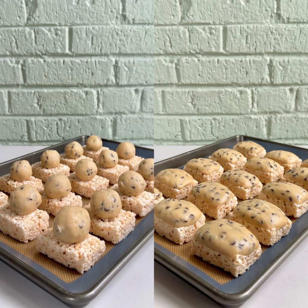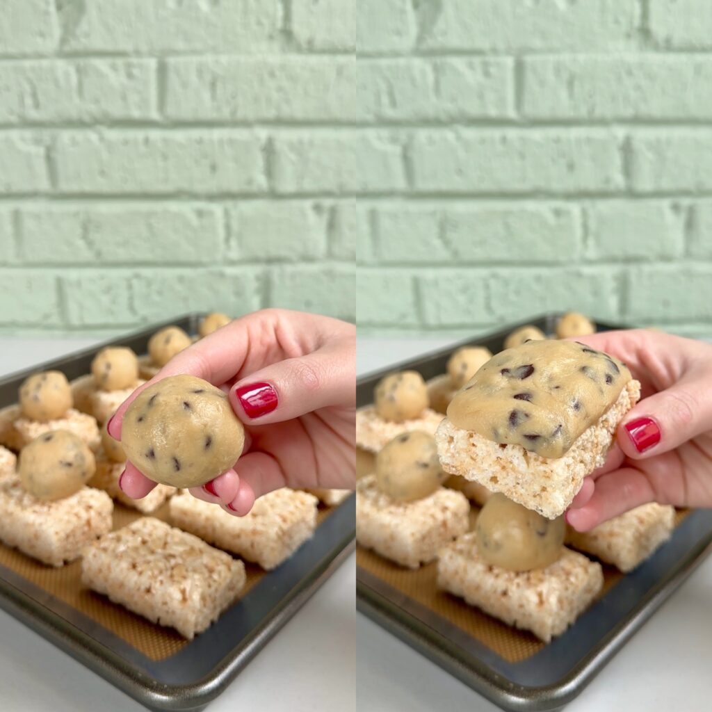 - Carefully flatten the cookie dough balls onto the surface of each Rice Krispie Treat, spreading all the way to the edges.
