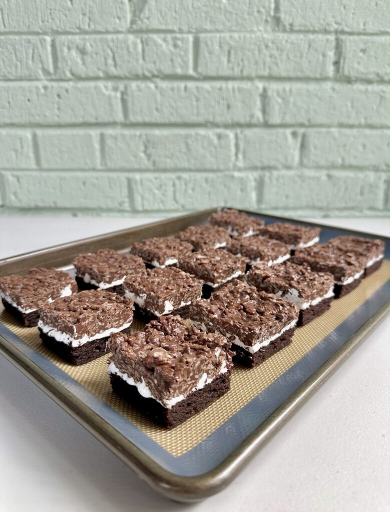 - COOLING: It’s important to let the brownies cool completely before topping them with your marshmallow fluff and Rice Krispie mixture. If you top warm brownies, the brownies will likely sink and become soggy.
