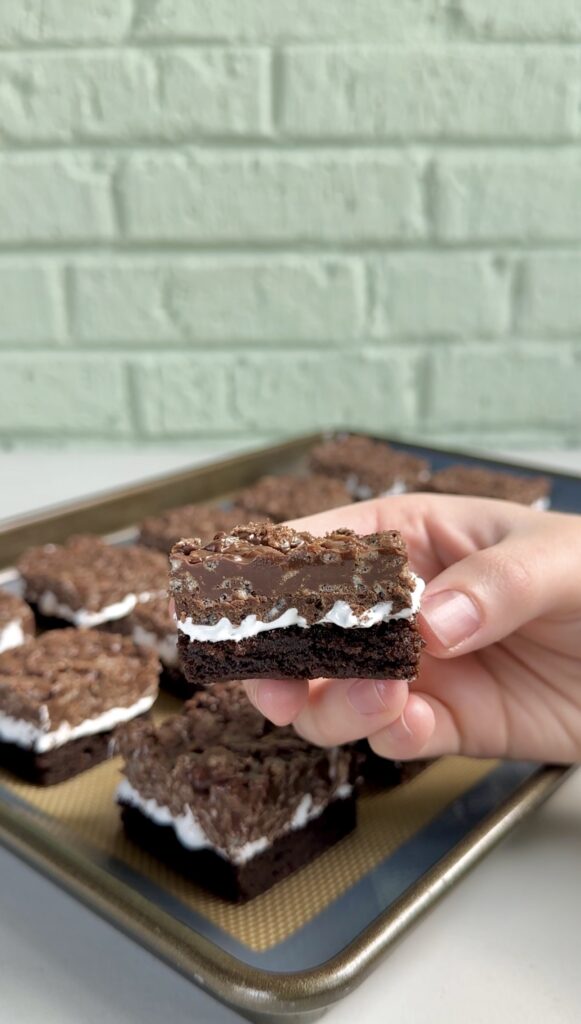 The bottom layer is dense and deeply chocolatey. The middle is soft and sweet with that nostalgic marshmallow flavor. The top layer is crunchy, chewy, and packed with chocolate peanut butter goodness. Every bite has contrast. Fudgy meets crispy. Rich meets sweet. It’s the kind of texture combination that keeps you reaching for “just one more” square.
