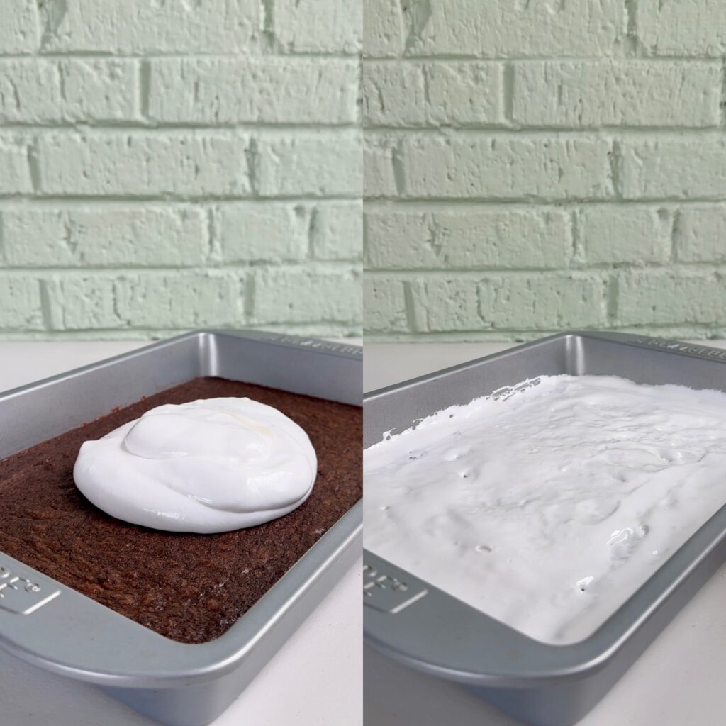 - Spread your marshmallow fluff into an even layer on top of the brownies, then set aside.