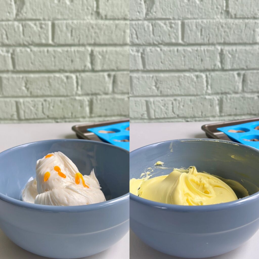 • Add the icing into a small bowl then stir in the yellow food coloring.