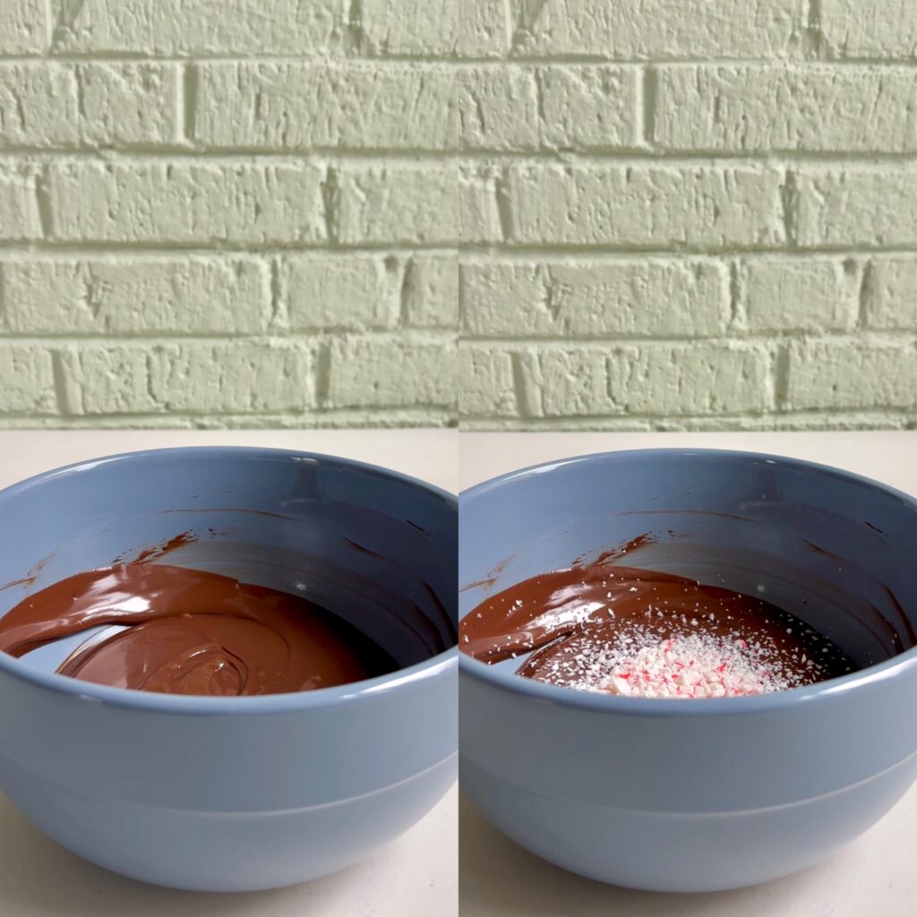 - Stir in 2 tbsp of the crushed peppermint candy, then spread the melted chocolate into an even layer on a baking sheet with parchment paper or a silicone baking mat.