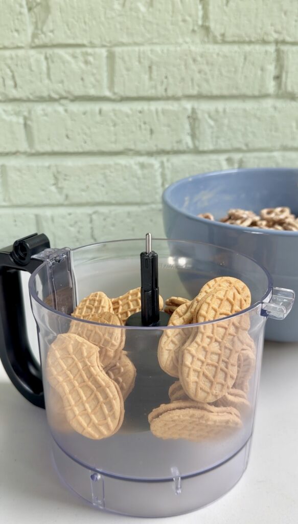 • Add your Nutter Butter cookies to the bowl of a food processor and pulse to crush the cookies into tiny crumbs. You can also crush them with a Ziploc bag and rolling pin if you don’t have a food processor.