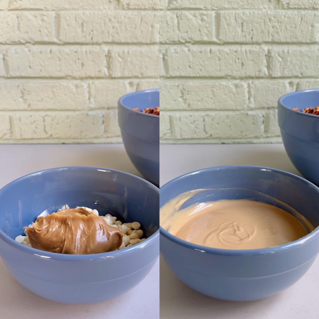 • In a microwave safe bowl, combine the white chocolate chips and peanut butter. Microwave in 30 second intervals, stirring in-between until the chocolate is melted and smooth.