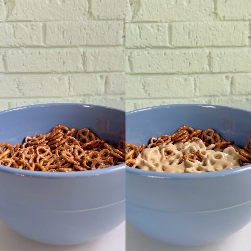 • Pour your pretzels into a large mixing bowl and set aside.
