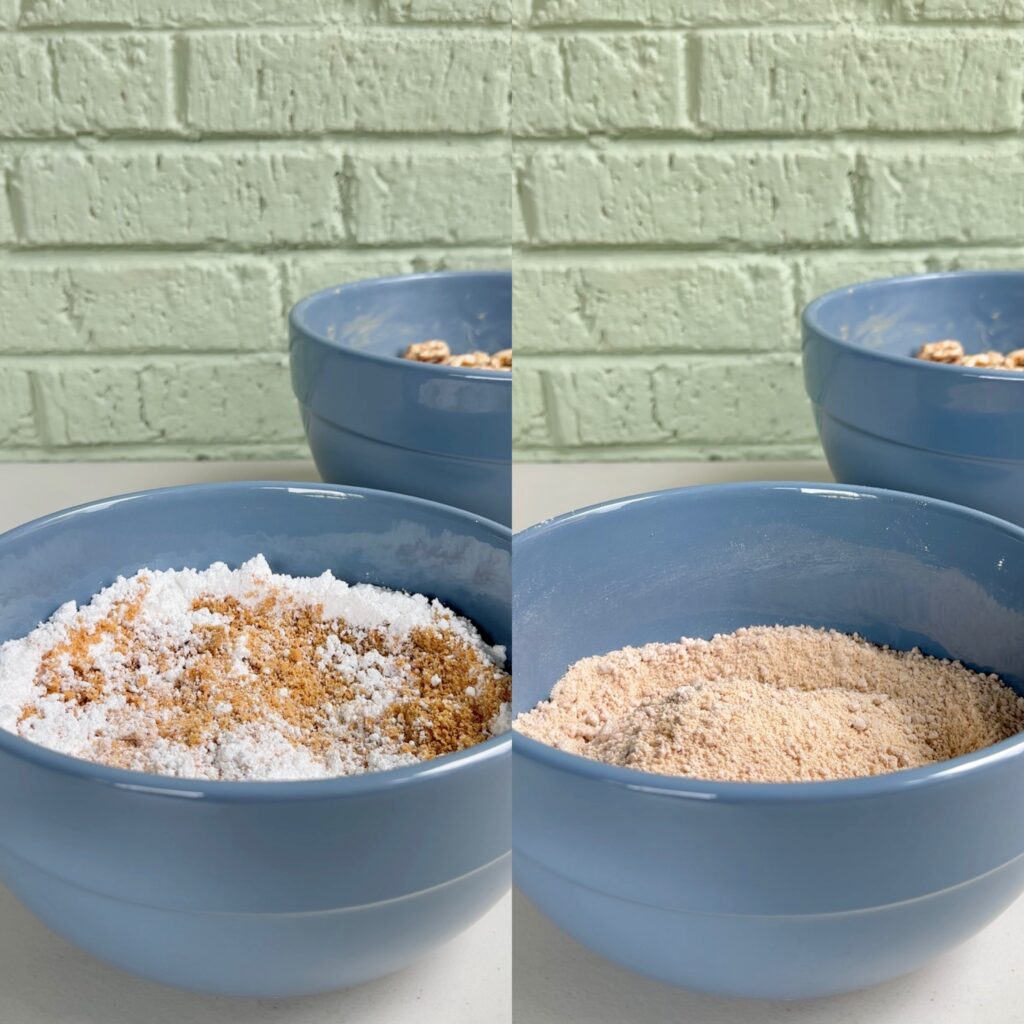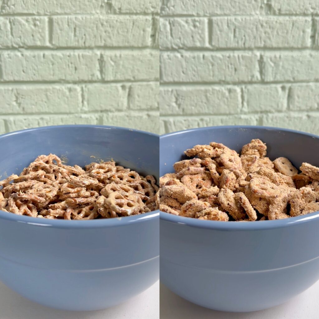 • BOWL SIZE: Use the biggest bowl you can find for tossing the pretzels! A big bowl makes it so much easier to ensure the pretzels get fully coated in the chocolate peanut butter mixture as well as the cookie crumbs and powdered sugar.