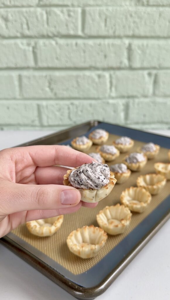 - Transfer the Oreo cheesecake filling into a piping bag or Ziploc bag, cut off one end, then pipe about 1 tbsp of filling into each cooled phyllo shell.