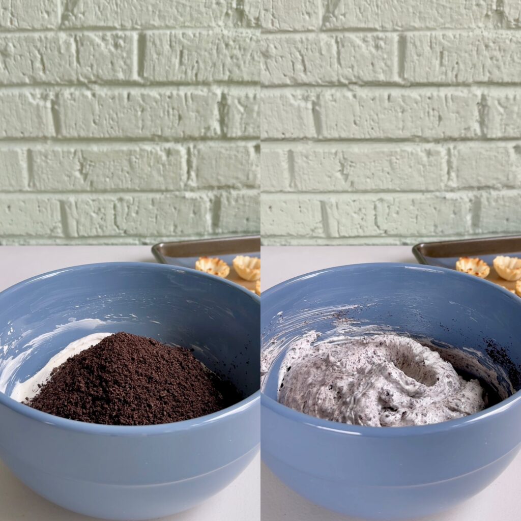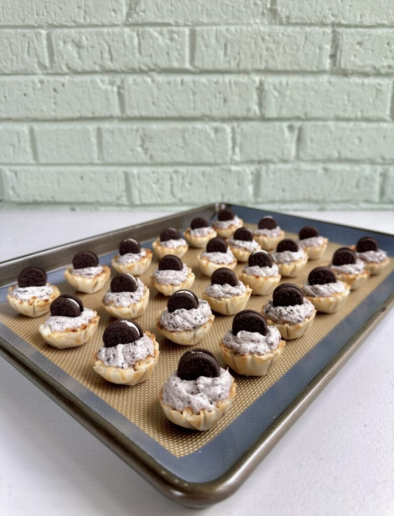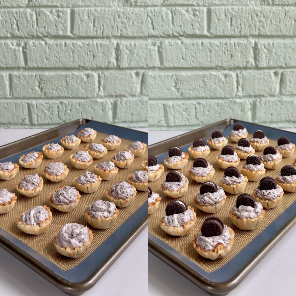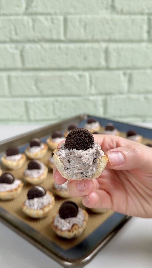 Another reason people love this recipe is how quick it is to put together. You simply mix softened cream cheese with heavy cream, powdered sugar, and vanilla until it’s smooth and fluffy. Then crushed Oreos get folded into the mixture, giving the filling that signature cookies-and-cream taste. Once the filling is ready, you spoon or pipe it into the phyllo cups and place a mini Oreo on top. That’s really all there is to it!