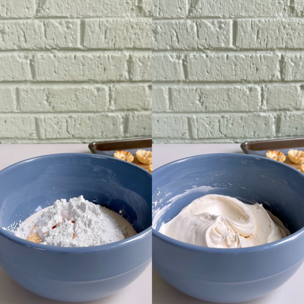 - In a medium mixing bowl, combine softened cream cheese, heavy whipping cream, powdered sugar, and vanilla extract. Using an electric mixer, mix until smooth and creamy.