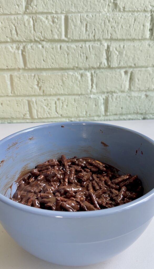 • PRETZELS: Pretzel sticks are my favorite, but you can use mini twists, or snaps instead. Just make sure you are breaking them up a bit prior to adding them into the melted chocolate and peanut butter.