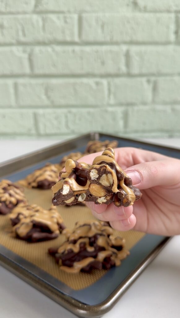 These clusters are the perfect mix of crunchy and creamy too. The pretzels give that salty snap. The peanuts add extra crunch. The chocolate and peanut butter mixture wraps everything in a smooth, rich coating!