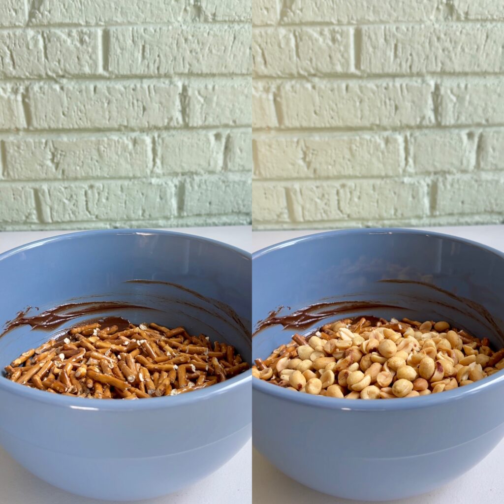 • Break the pretzel sticks into smaller pieces, then add the broken pretzel sticks and peanuts into the melted chocolate and peanut butter mixture and stir to combine.