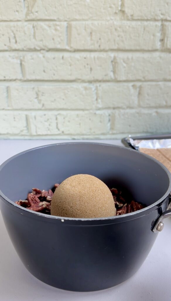 - In a saucepan over medium heat, combine the butter, brown sugar, and pecans. Bring the mixture to a boil then continue cooking for 2 minutes, stirring constantly.