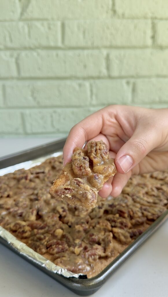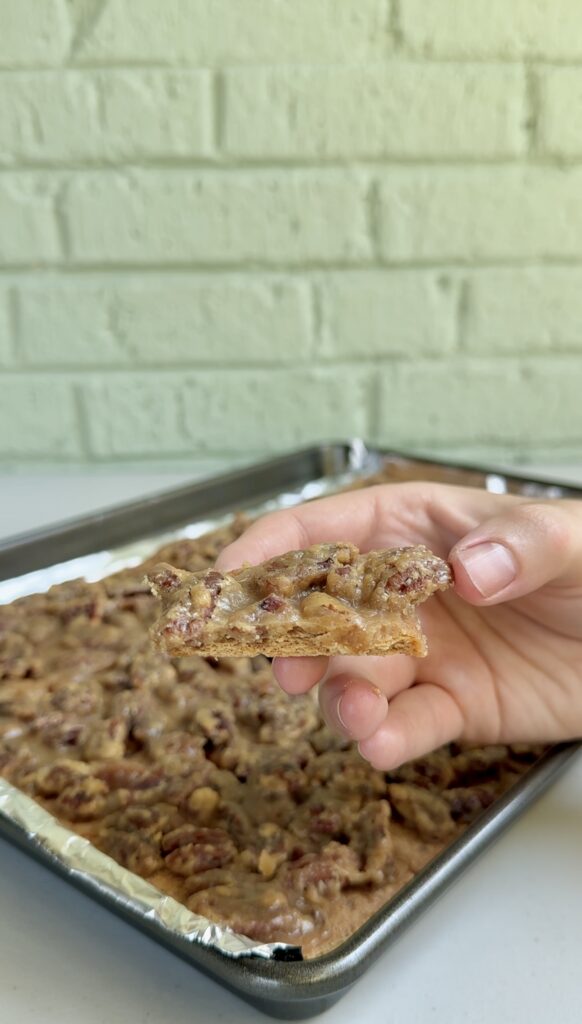 - SPREADING: You’ll want to work quickly to spread the pecan topping on top of the graham crackers. Once the mixture starts to cool, it becomes much harder to spread into an even layer.