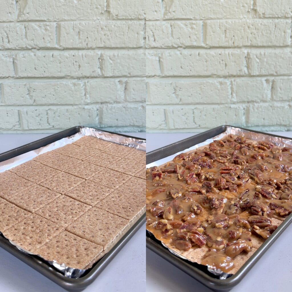 - Remove from heat and stir in the vanilla extract. Immediately pour the hot pecan mixture over the graham crackers and spread to the edges to completely cover the graham crackers.