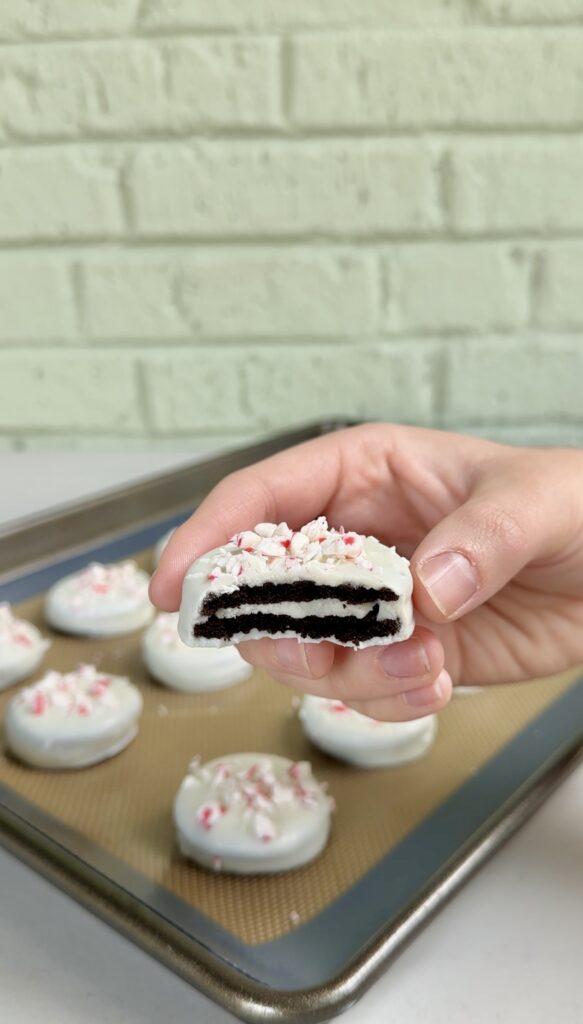 One of the best things about this recipe is that it’s completely no-bake. You don’t need an oven, and you don’t need baking experience! All it takes is a quick melt of chocolate in the microwave or on the stovetop, a dip, a sprinkle, and a few minutes to let them set. This simplicity makes Peppermint Bark Oreos perfect for busy holiday schedules or for making with kids who want to help in the kitchen.