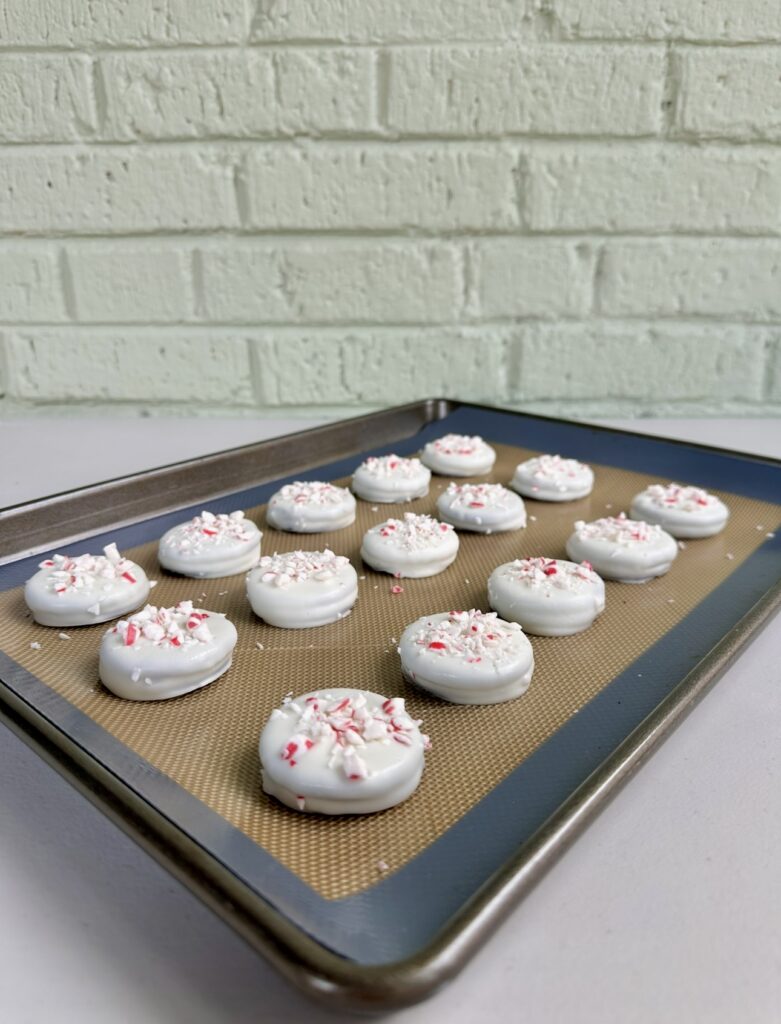 Peppermint Bark Oreos are chocolate-dipped Oreo cookies topped with crushed candy canes, creating a festive, minty, no-bake holiday treat.