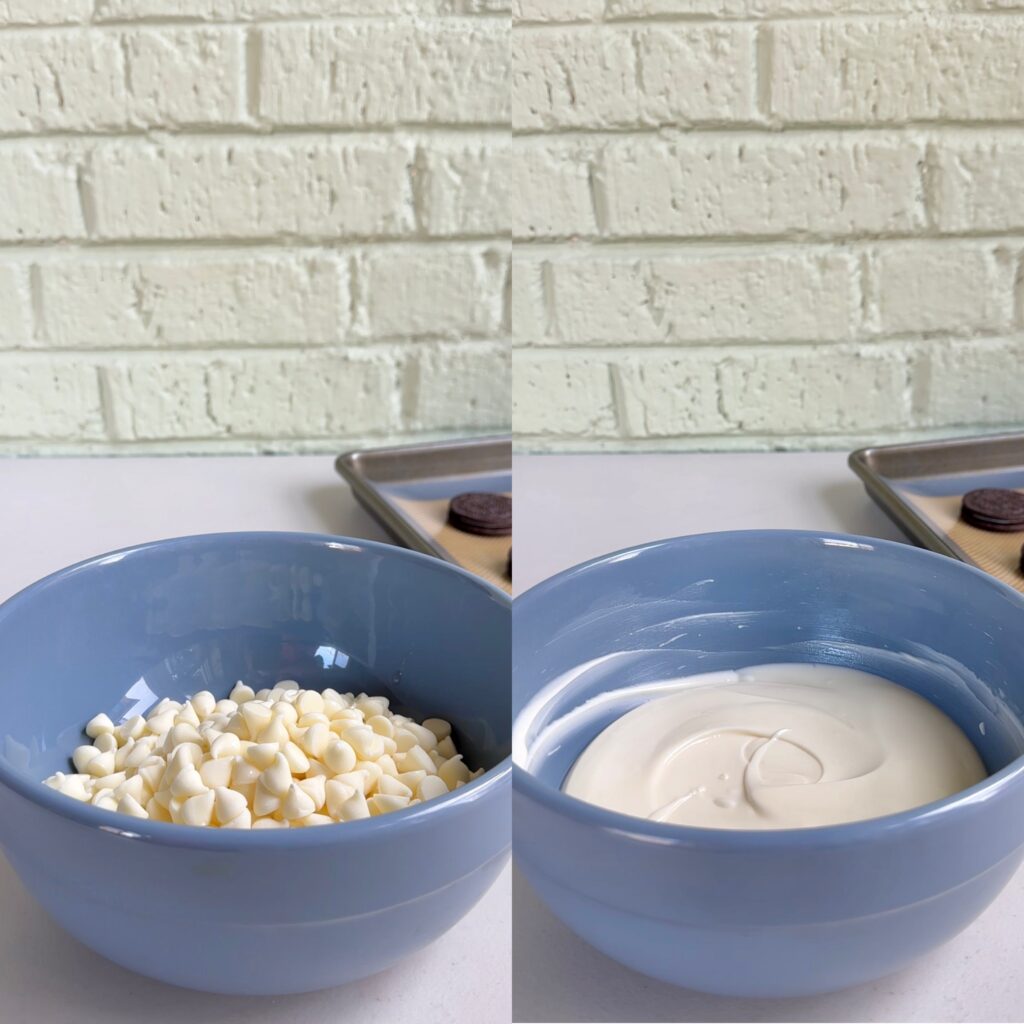 - In a microwave safe bowl, combine white chocolate chips with vegetable oil.
