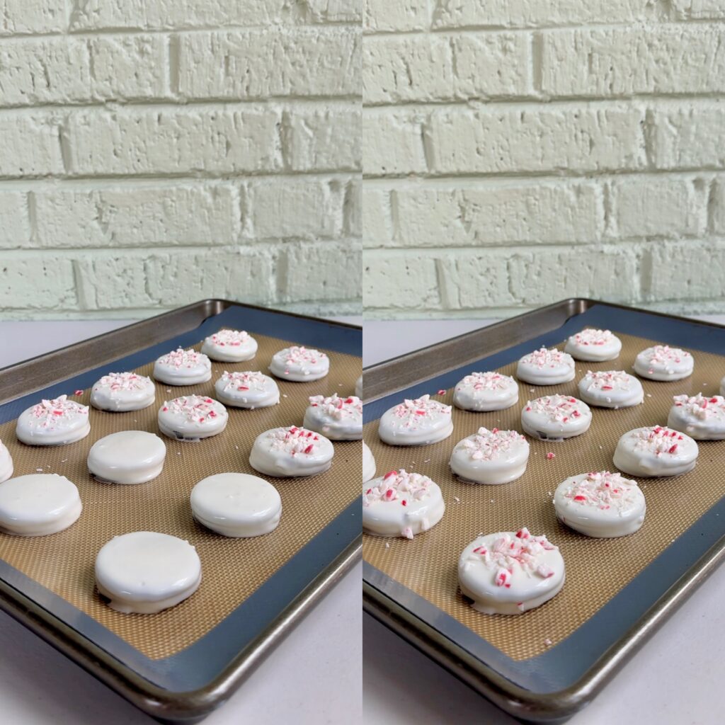 - TOPPING: The wet chocolate acts as a glue for the crushed peppermint pieces to stick to, so it’s important to top these with peppermint candy before the white chocolate has set.