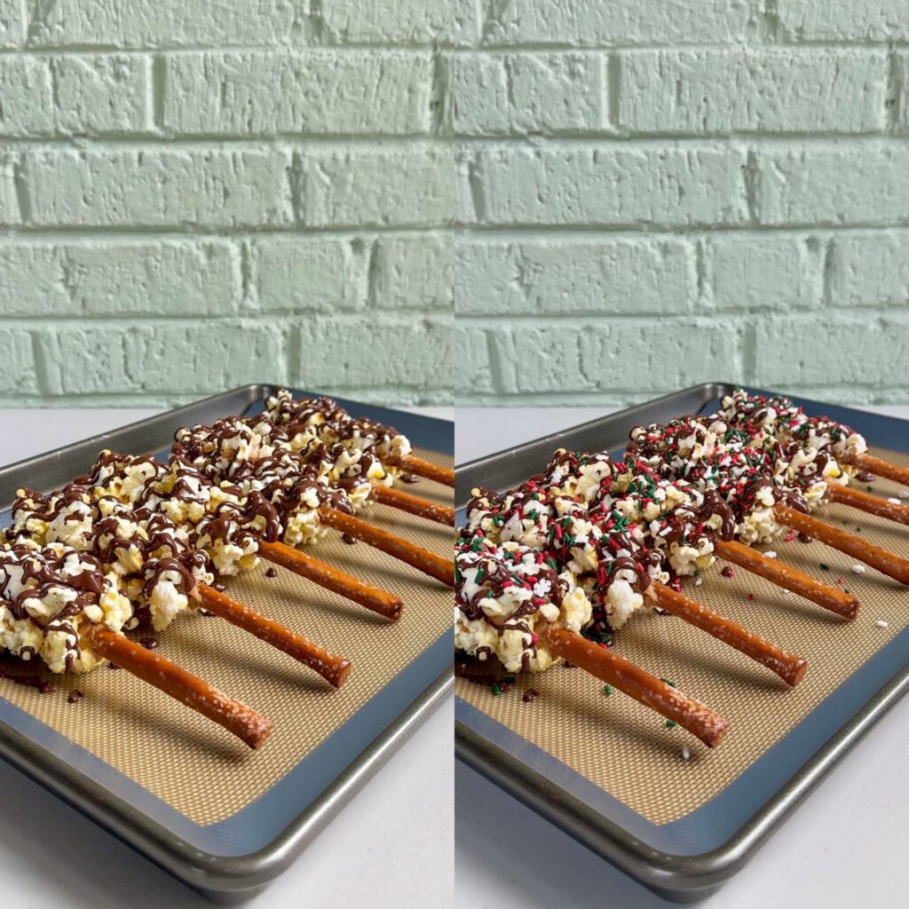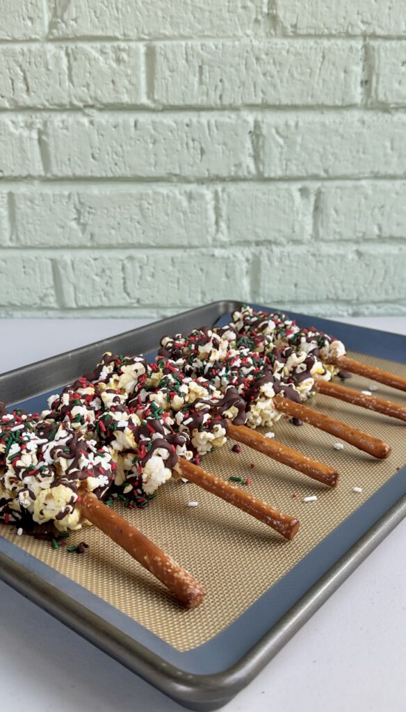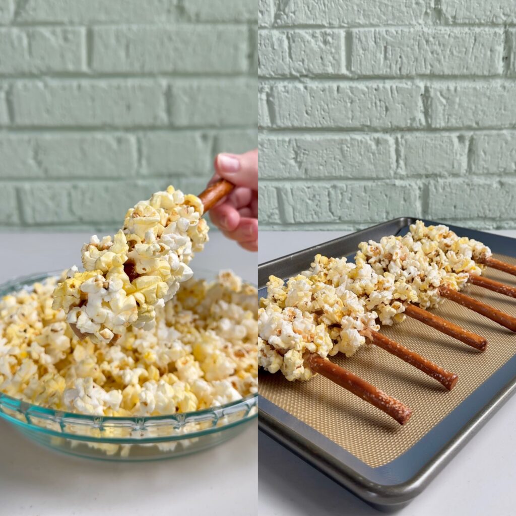 • Press and roll the popcorn onto the peanut butter to coat, then place the popcorn coated pretzel rods onto baking sheets lined with parchment paper or silicone baking mats.