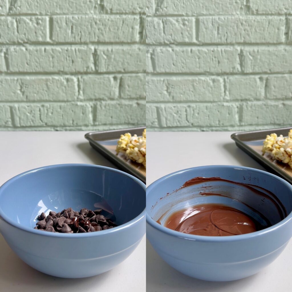 • CHILLING: You can let the chocolate drizzle set at room temperature, but it will take longer for the chocolate to fully harden. To speed up the process, feel free to place the popcorn in the fridge for 30 minutes to set the chocolate drizzle.