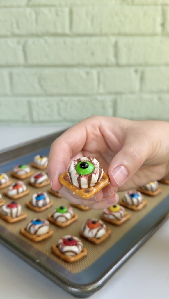 What makes these Eyeball Pretzels so good is the irresistible combination of textures and flavors: the crunchy, salty base of the pretzel perfectly balances the sweet, creamy swirl of the Hershey’s Hug, while the crisp M&M on top adds just the right pop of color and bite. Every little piece delivers a satisfying snap, a smooth melt, and a sweet finish.