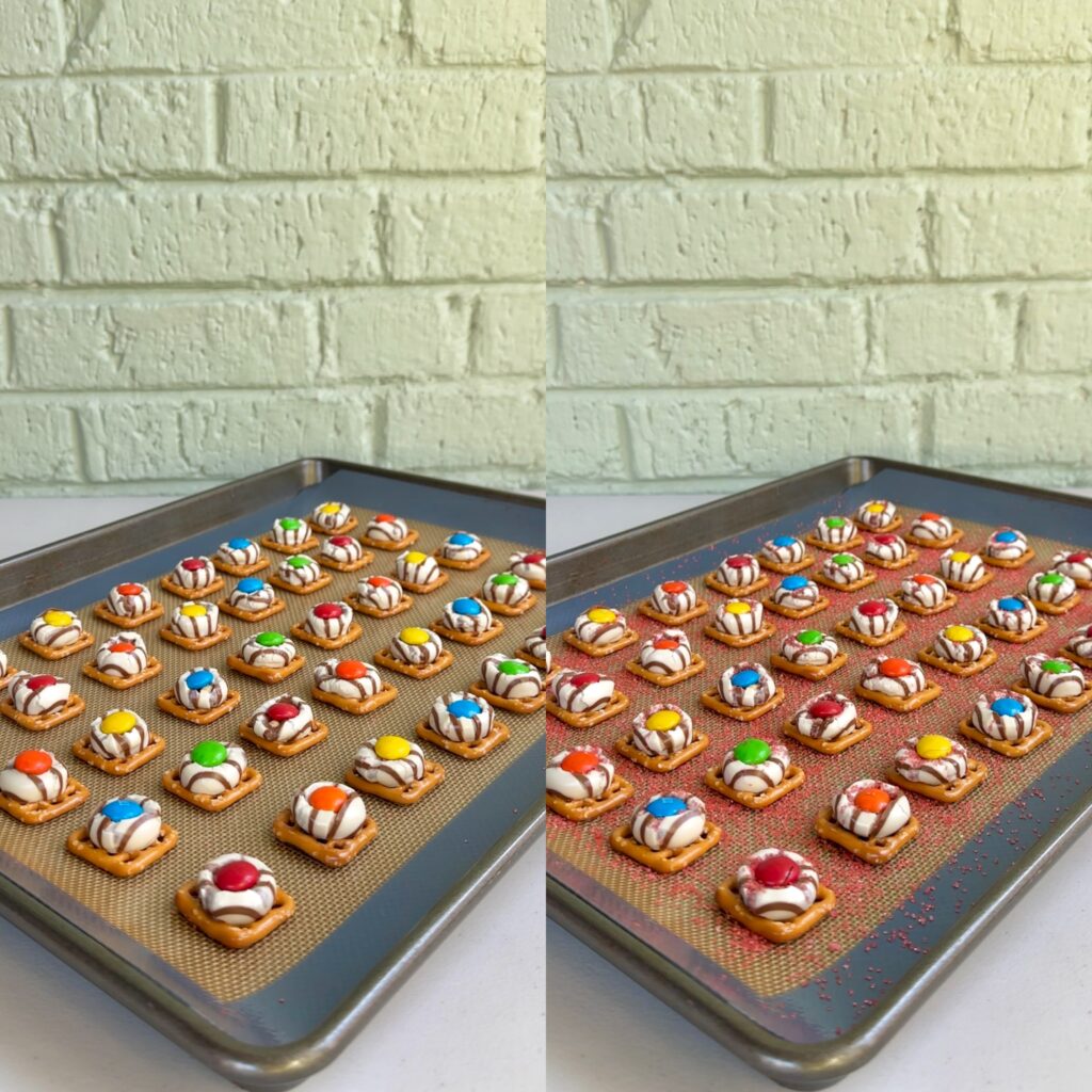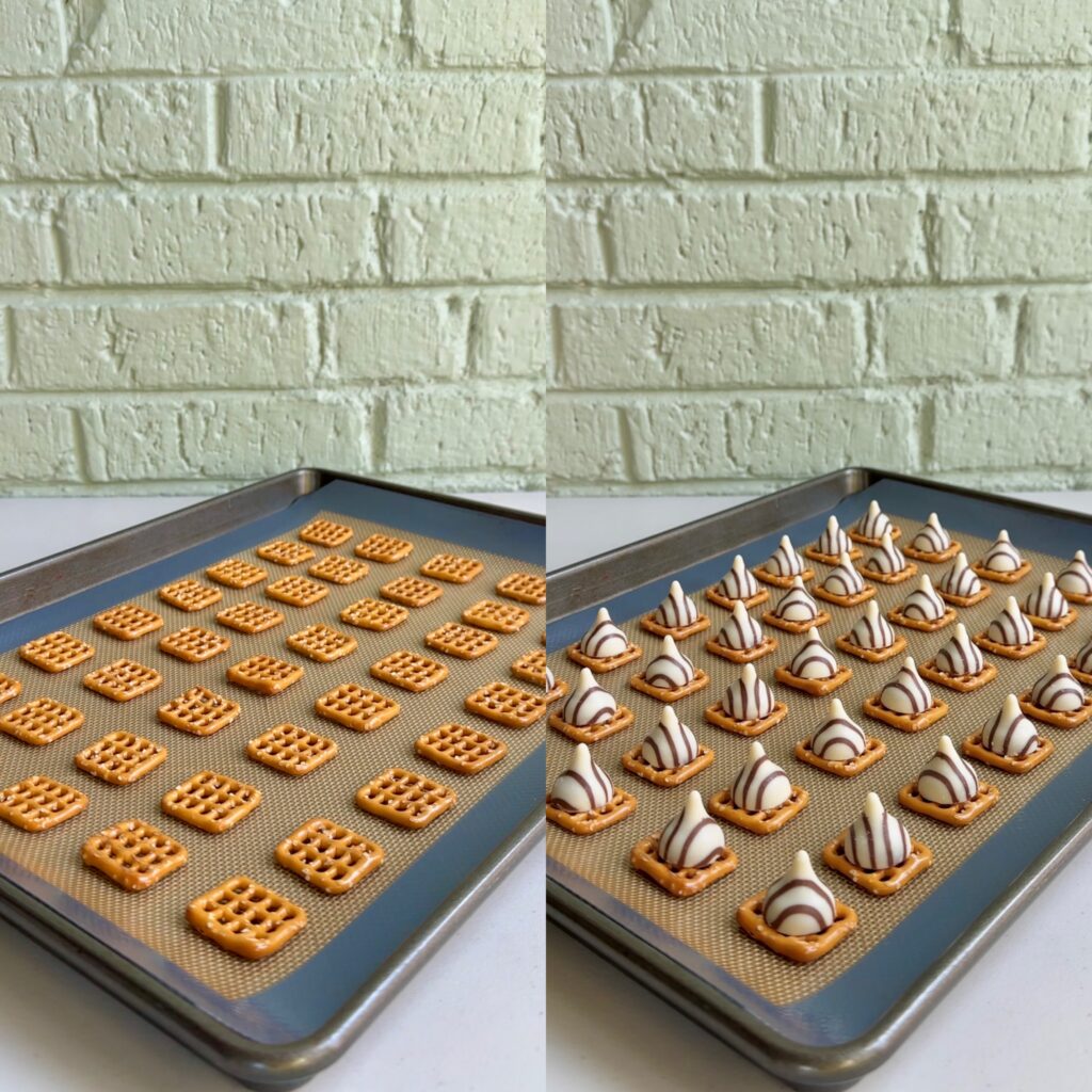 - BAKING: When baking the Hugs onto the pretzels, watch them closely… they should be shiny and soft, not melted!
