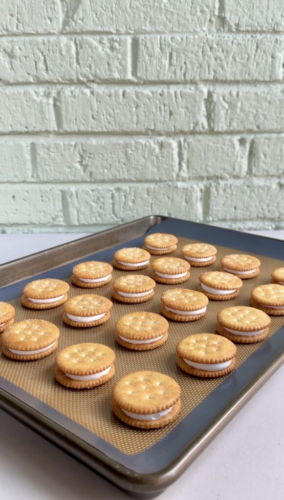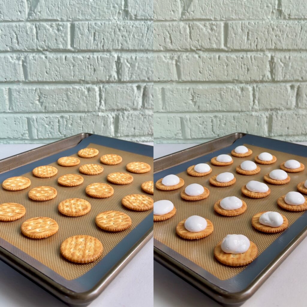 - Line a baking sheet with parchment paper or a silicone baking mat, then place half of the Ritz crackers upside down on the baking sheet.